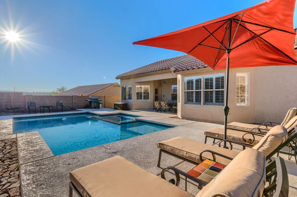 4 bd, 2 ba | Newest addition with pool, hot tub, and relaxing lounging for the family.